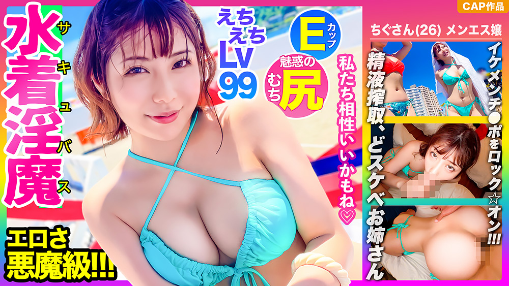 水着美女をゲットする為に神○川県某有名ビーチにやって参りました!職場の同僚と遊びに来ていた色気ダダ漏れのメンエス嬢【ちぐさん・26歳】に水着モデルをお願いします!と声を掛ける⇒ご飯を奢って夜に飲み会の約束。コテージに集合、お酒を飲んで打ち解けたところで大金を見せつけてエッチの打診!粘りの説得で交渉成立。ベッドへ移動してイチャイチャで発情。水着に着替えて股間に電マを当てると感じ始めたのでクンニと手マンでビクビクとイク!!感度めっちゃ良いww涎ダラダラでジュポジュポとチンポを味わうようなフェラもエロすぎww相性抜群な様で挿入してチンポを出し入れする度に「気持ちぃ!」と叫んでイキまくりww色白で美しい桃尻を拝みながらのバックで思わず…ドピュっと中に出ちゃったww溢れる精子を見ながらまだまだ収まらないのでおかわりピストンで奥をズンズン突く!押し寄せる快楽の波にエンドレス絶頂!最後は綺麗なお顔にぶっかけ×2発!!「相性抜群だったね!」とたくさん気持ち良くなって大満足のご様子ww金玉カラッポになるまで精子搾り取られちゃいましたwww
